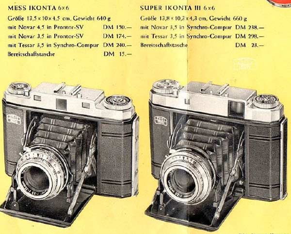 In the detail of a Zeiss Ikon catalog from the late 1950s, we can see the price difference between the same models when equipped with Novar or Tessar, f/3.5 or f/4.5 and Prontor-SV shutter or the more sophisticated Synchro- Compur. With the same shutter and aperture, Tessar’s inclusion in the Super Ikonta III (which is the IV without a light meter) raises the price by DM 60, ~ 25% more expensive.
