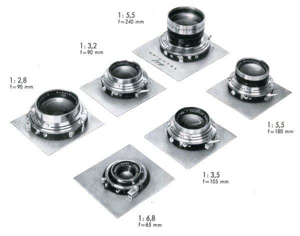 The Linhof medium format was usually sold as a set. In addition to the body and some accessories it usually came with three lenses. One normal, one wideangle and one of longer focus. But being a camera with lens board and ground glass, it is clear that anyone could adapt any lens that would fit the camera sizing. The most sophisticated lens set was formed by:
