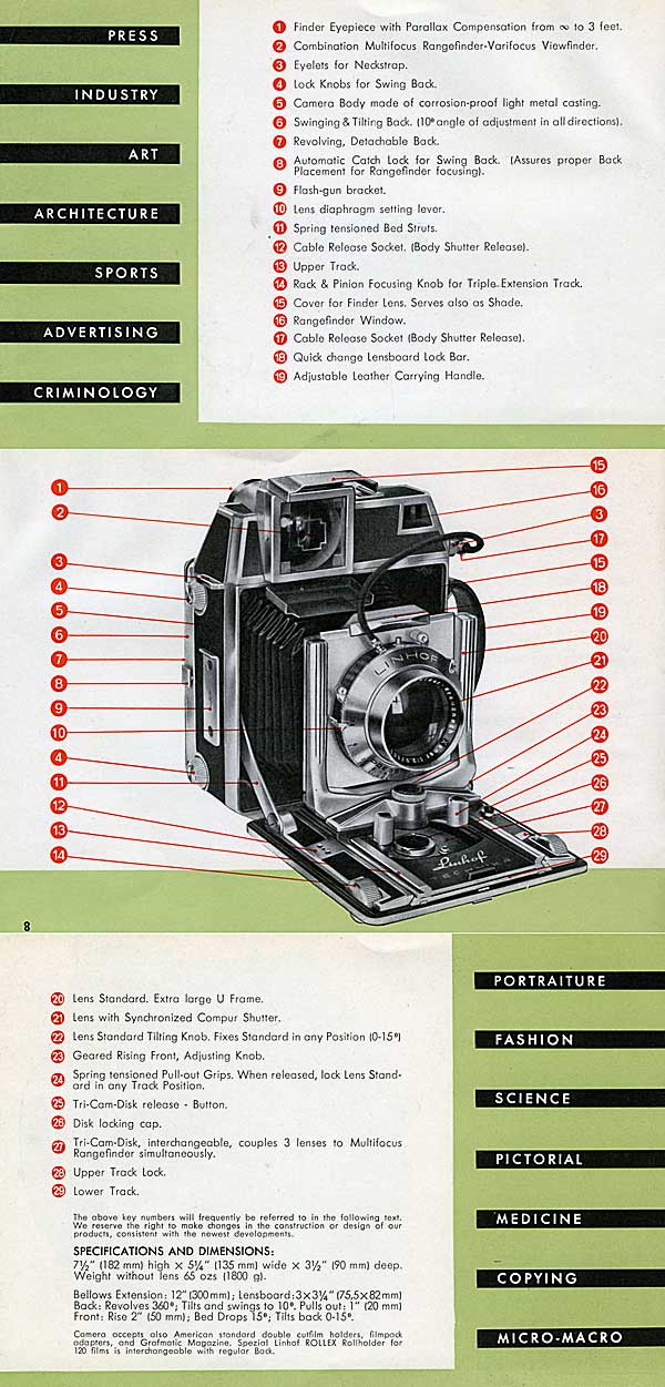 Once granted the features allowing the claim that it works in handheld photography, such as a 35mm, there comes the Large Format side. At this point, as a medium format, it far surpasses its competitors like Graflex’s Graphics.