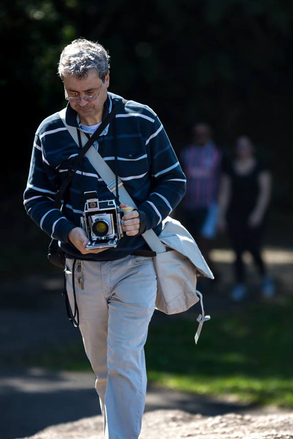Another handheld portrait. It is very practical to shoot that way but, on the other hand, with a tripod and the features that Linhof 23 offers would have been interesting to tilt the film a little, stop down the lens, and bring the lenses that appear in the foreground in focus. But it is not possible to have it all. Not even with a Linhof.