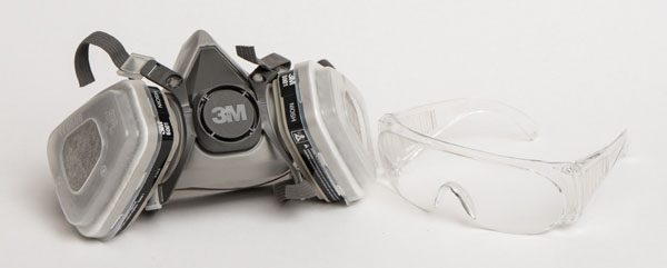 Goggles and a mask are easily found and help a lot to avoid accidents. The mask, for general use in a photo laboratory, must be of the type that does not allow the passage of particles and also organic vapors. Talk to your supplier to see the brand / model he recommends in this regard.