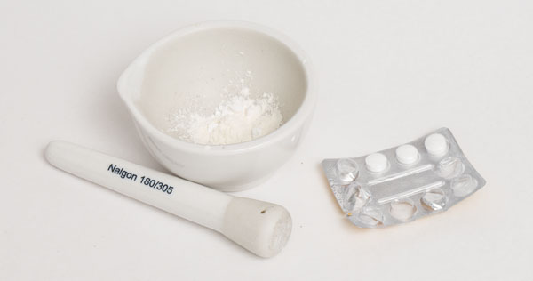 2. Weigh the reagents according to the formula already mentioned, paracetamol 15g, sodium sulfite 50g and sodium hydroxide 20g. If you are using the painkiller you must crush the pills in a mortar like the one in the photo to make them powder. 30 tablets of 500mg or equivalent will be required. Another technique is to place the pills in a very strong plastic bag and crush them by tapping them with a hammer.