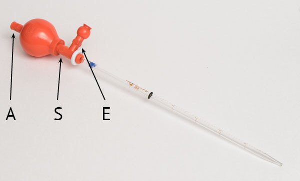 2. With the bulb deformed, dip the tip of the pipette in the liquid press the S valve. You will see the liquid rising up the tube. Release valve S to close it when the liquid has reached the desired graduation.