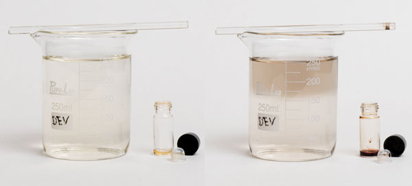 The result is that once diluted, Parodinal should be used immediately. Even at the end of a 10-minute development, it is already possible to notice a darker brown color that will darken even more in a short time. The photos above were made with the Parodinal diluted 1:50, at room temperature, around 23ºC (73ºF), at time zero and 4 hours later. This is the oxidation of the developer in contact with air only, with no film development.