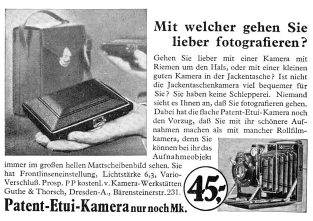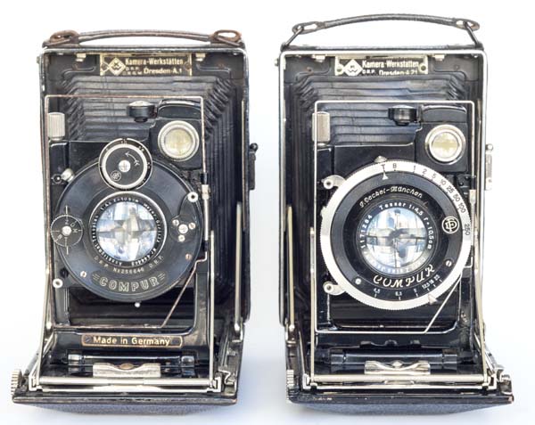 I have two samples in the collection, one with the recently discovered and desired Trioplan and another with the excellent but less glamorous Tessar. I have not been able to precisely date the two cameras. The Patent-Etui was manufactured from 1920 to 1938 but the one on the left, pictured above, with the Trioplan, has an older Compur (dial set type) and is certainly older than the Tessar on the right whose rim set type Compur was introduced. in 1931.