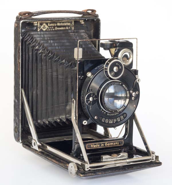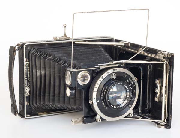 This is a camera that really adds as little volume as possible to the lens + image plane binomial. Being a folding it is very reduced when closed and when opened it is curious to see how everything folds and finds its space inside the small case into which it becomes when closed again. This compression feat is accomplished without loss of features even compared to high-end cameras in the class. The Patent-Etui-Kamera is a 6.5 x 9 cm camera (also available in 9 x 12 cm) with Compur shutter with B, T and speeds from 1 to 1/250 s, focus per rack and double bellows extension. Its lenses are bright, usually 105mm and f/4.5.