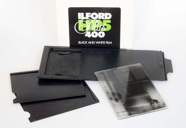 Initially designed for glass plates, it is also possible to use film on plates as long as an adapter is placed on the film holder (on the left in the photo). But the most fun thing is to prepare silver gelatine and emulsify your own plates. The plate on the right is a 6.5 x 9 cm glass, 1 mm thick, which has been given a homemade emulsion.