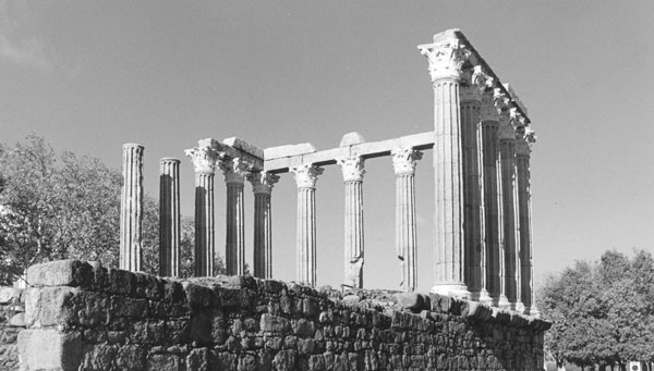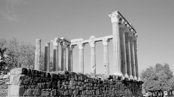This image is a direct scan of the negative of a photo taken at a Roman temple in the city of Évora, Portugal, it was taken with an Olympus OM1n and a 50mm lens. I needed to tilt the camera up a bit so I could put the whole temple in the picture. Otherwise, if I left the horizon right in the middle of the photo, I would take a lot of ground (which has been cut even further in this image) and leave the tops of the columns out of the photo. With this option the columns came out just as if tumbling back a little.