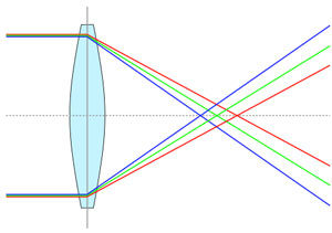 Dispersion and Refractive indexes are characteristics of glass and vary from one to another. So they are selected according to the ends of specific usages. High refraction and high dispersion are desirable for prisms, when color separation is important. In lenses, high dispersion worsen chromatism, that is the effect of a lens not being able to focus all colors at once in one single focus plane. Some colors focus at shorter distances and others at longer distances. The figure below illustrates that effect.