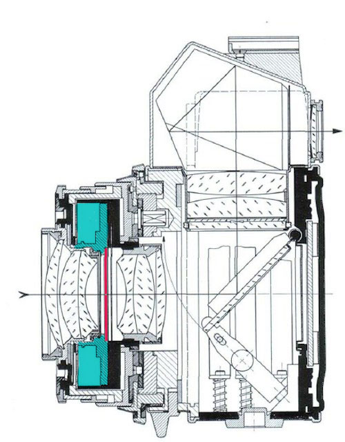 In this new illustration we have the same type of C lens on a Retina Reflex. The shutter, a Synchro Compur, is in a box in the form of a thick ring with a more or less square section marked in blue in the vertical cut of the drawing above. The shutter blades are positioned approximately on the red painted stripe. The lenses on the left are removable and those on the right are part of camera body.