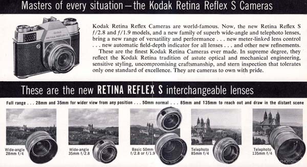 The C system in a SLR camera was not very well received as Kodak AG quickly offered a new Retina Reflex without fixed lenses on the camera body. We can imagine how difficult it must have been to take the Synchro Compur shutter behind the entire optical setting and providing yet room for the movable mirror between shutter and the film. This was done from 1959 when Retina Reflex S was launched, in this new version the lenses are complete and independent optics.