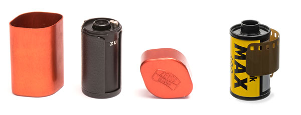 Above we see a robust reusable cartridge from Zeiss Ikon, with its elegant metallic box. Next to it, a disposable (recent) cartridge, in the format launched by Kodak in 1934, which would become an industry standard.