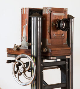 The studios in small towns used to do most of their business with so-called “social” photos, of events such as weddings, baptisms, graduations and family portraits in general. Located right in the city center, close to the main church, they also had a considerable business base in document photos. In none of these cases would a camera like this Thornton Pickard, a field camera, be the most suitable. For events, something truly portable is needed and for studios, when you want a large format such as 18×24 cm, the cameras literally called “studio cameras”, which are permanently mounted, make more sense. They have reducing backs to also take photos for documents, with 2×2 or 3×4 cm being the most common formats. But the 18x24cm were used for photos of babies, brides and grooms and families.