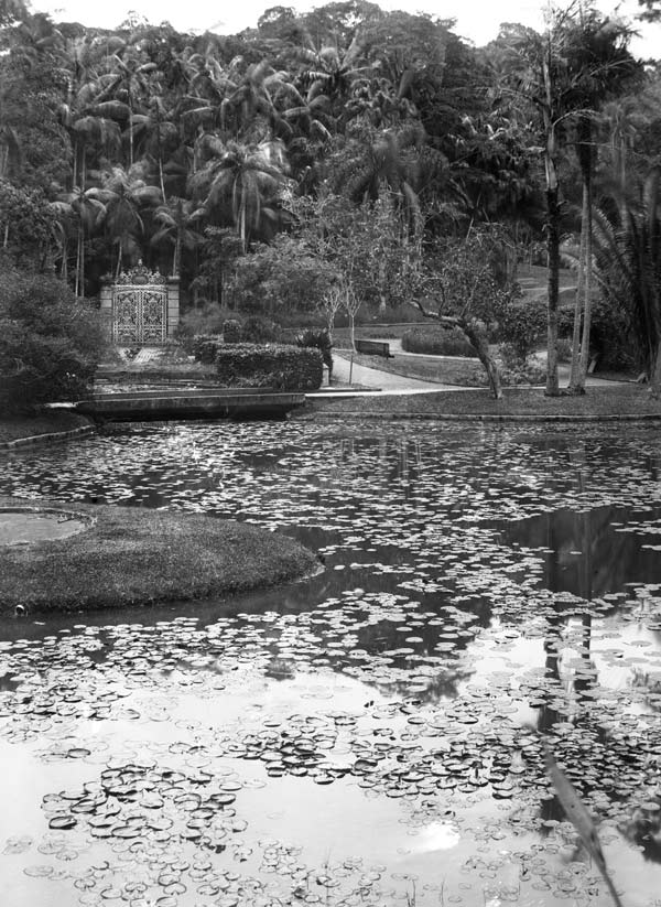 In this other situation, the lens was a very old Lerebours et Secretan landscape lens, with the washer diaphragm in the front. The shutter was the lens cap itself because the exposure was very long because I was using a home made dry plate and an aperture f/45. The rear of the camera was tilted to focus on the aquatic plants in the foreground and also the landscape on the other side of the lake. Below is the result.