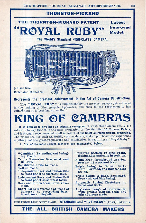 An 18×24 cm field camera, like this Thornton Pickard Royal Ruby Triple Extension, would be more for outdoors work, when superior quality was desired with a really large negative. Photos of factories, architecture, landscapes, large groups, such as at parties or public events occasions, inaugurations and things like that. It could also be for the photographer’s enjoyment doing more personal work with a camera full of features like the Royal Ruby. This perhaps explains the excellent condition in which it is preserved to this day. It was probably a camera only for special situations when large format and a certain flexibility needed to converge in a single camera.