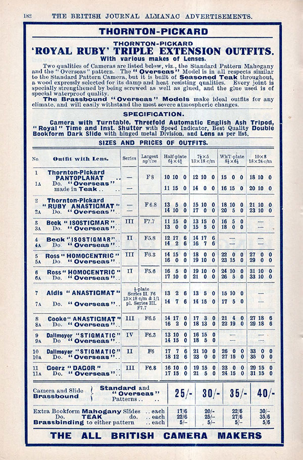 In the presented catalogue pages we can see that 18×24 cm was the largest size available in metric system. It was the successor size to the “full plate” that was used in Europe practically since the invention of photography. In England and the United States, in the Imperial System, its equivalent is 8×10″, which is slightly larger. The catalog emphasizes the robustness and resistance of the camera. It says that in addition to the metal reinforcements, the wooden parts are glued with waterproof glue. The wood used is mahogany, which is the case with this model, but they also offered an overseas model, made of teak, which is a very resistant wood used in the shipbuilding industry, as it has a high oil content and silica, making it especially suitable for applications in hot and humid climates.