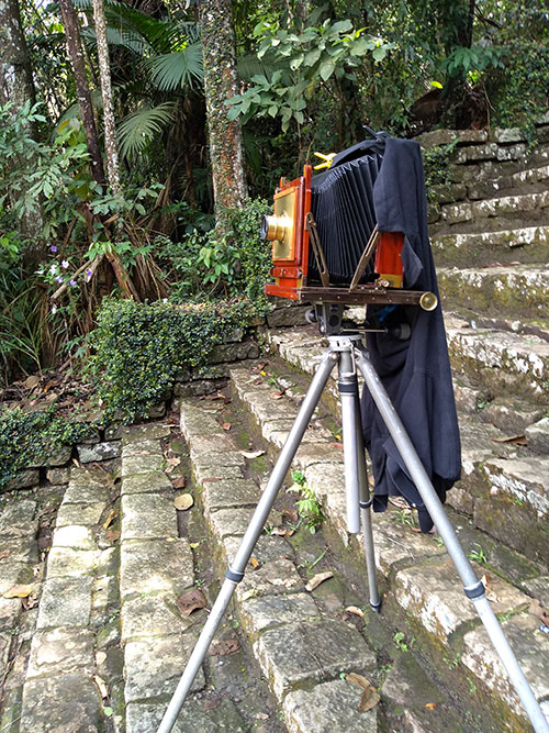 Being a field camera, supposedly for use in the field, it came with leather cases for the camera itself and 3 more film/plate hoders, another case with 3 more extra holders and even a tripod also with its own leather case. But the tripod does not have a head with adjustments in three dimensions. It simply offers a disc platform, on which the disc of the camera base rests and so, after leveling the tripod base, all that is left is the rotation movement on a vertical axis and the movements of the lens to create a composition. Normally I use a conventional tripod which is much more convenient.
