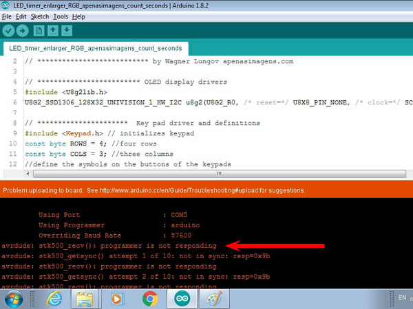 The IDE will try 10 times to upload. Theoretically it is still possible to have the luck of pressing RESET at the right time, during these 10 attempts, but I almost never managed to get this good moment right and so I adopted the procedure to wait for the 10 attempts to fail and start again by clicking upload in the IDE. - A first test you need to do is to see if the numbers you type appear correctly on the screen. If not, you will need to change one line in the sketch. Below is shown where this should be done.