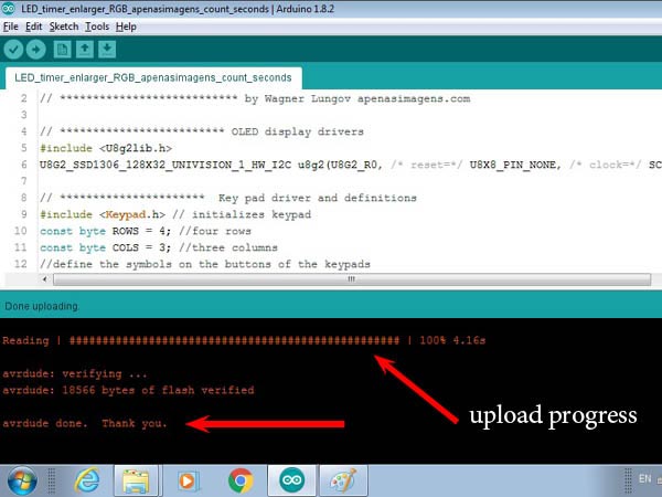 At that time you press RESET. If it was the lucky time you will see a progress bar made up of ##### indicating that the program is being sent to the Pro-Mini. It is very fast. It will end with a Thank you.