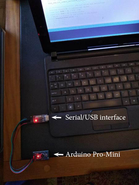 - After loading the sketch you can connect the Pro-Mini to the Serial / USB interface (you will need to buy one, if you don’t have it), following the indication of the cables, remembering that the TX of one goes in the RX of the other and vice versa , VCC with VCC and GND with GND. Plug it into your computer. I use a very old lap-top, with Windows XP, exclusively for lab stuff including the Arduino IDE. It is more so as not to throw it away. Since I do not connect it to the Internet, it does not receive garbage, and it will probably last as is for many years.