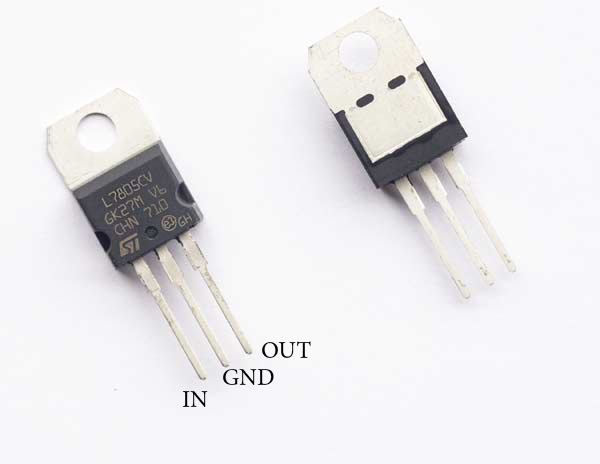 - In the holes connected to the IN and GND of the LM7805 (see below how the LM7805 pinout), connect the battery positive to the IN and the GND to the negative of the battery. But remember that these wires coming from the battery are going through the switch. The LM7805 will be switched on.