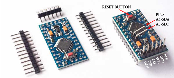 - To assemble the Pro-Mini you need to solder both male and female PCB connectors (printed circuit board). Females go on the PCB and males on the Pro-Mini (see component details below). Two rows of 12 female connectors will receive pins from the Pro-mini. A row of 8 males, positioned and connected to pins 2 to 9 on the Pro-Mini, will receive the keyboard connector (3 to 9) and a UV Sensor connector on pin 2.