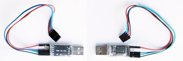Next, a typical serial / USP or USB to TTL interface, in detail, front and back. The wires are already arranged to plug directly into the Pro-Mini following the pattern of black – and red +.