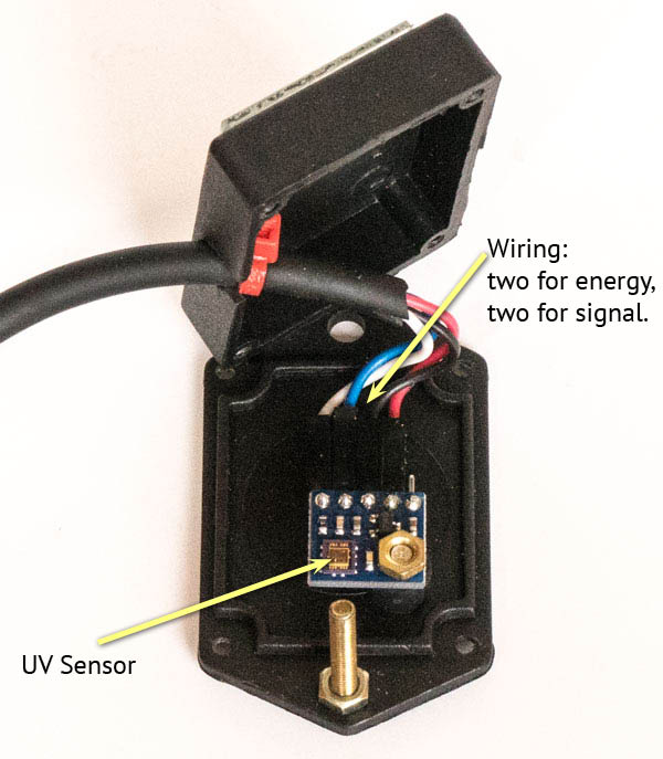Following is the ML8511 UV sensor. It is convenient that it be mounted in a separate box as it will obviously be out in the sun, but it is not practical that the control box is also exposed. It will be better for its conservation and also to facilitate the reading of the display, so that it stays in the shade. The long screw with nut seen in the photo below is only used to direct the sensor towards the sun. When the screw does not cast any shadow on either side of the nut, it means that the sensor is receiving direct sunlight.