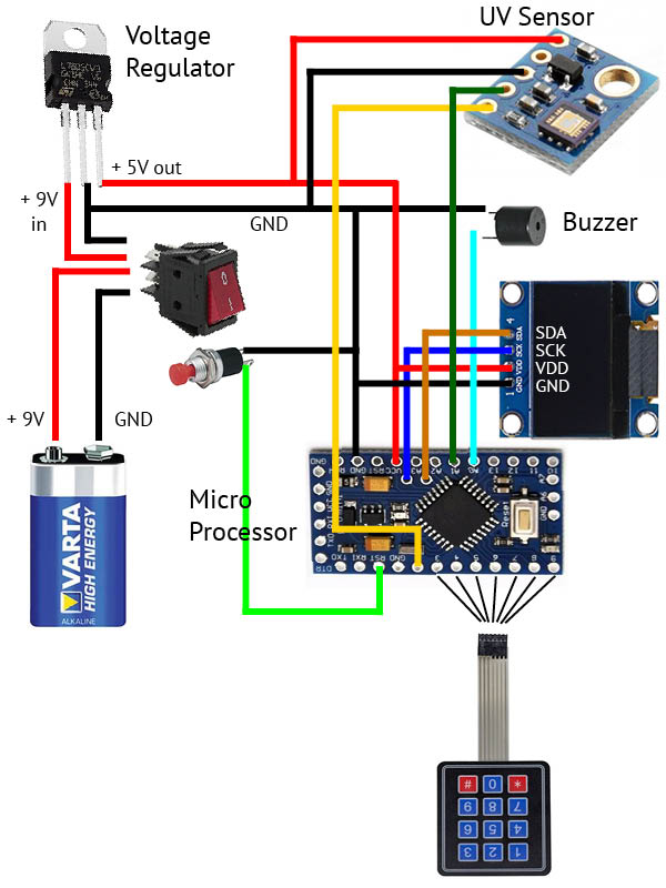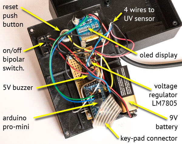 2) I think this project is the simplest way to “integrate” or accumulate the UV load over a certain period of time. It has the minimum that is needed: a sensor, a microprocessor, a buzzer, a screen, a keypad (these last two could be replaced by a mobile phone by using a microprocessor with wifi capabilities).