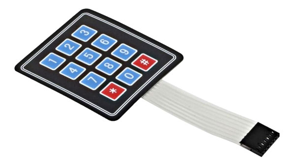 For this project, a self-adhesive membrane keyboard is ideal. It already comes with a ribbon and female connectors that you can plug directly into male connectors soldered on the board and corresponding to pins 3 to 9 of the Arduino. There are two groups, one of 3 and the other of 4 connectors corresponding to the 3 columns and 4 rows of the keyboard. Each time a key is pressed, a pair of terminals is short-circuited.