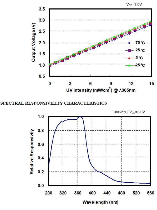 What really matters about the Sensor is its response to UV radiation. It is shown in the following charts from ML8511 Datasheet.