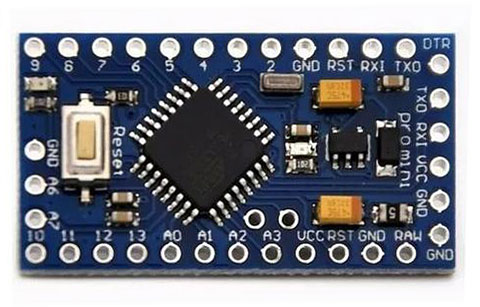 To assemble, buy a standard printed circuit board like the one in the photo below or similar. They typically have two long longitudinal tracks and two groups of four-hole tracks in the cross sections. The Pro-Mini needs a row of 12 holes. Cut the board around 20 holes and it will be enough (see the picture of the open box to understand)
