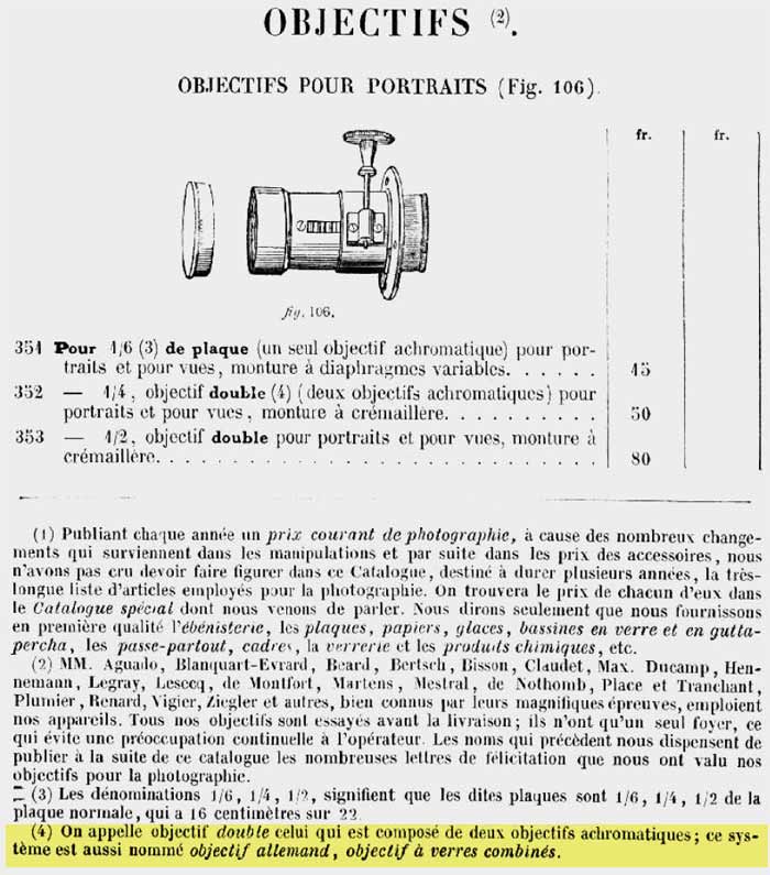 Eder (p. 296) laments the tendentious stance of Potonniée, a French historian, who in his Histoire de la Découverte de la Photographie attributes the success of Petzval’s lens to the fact that French people are fond of foreign products and value what is more expensive only by thinking that price indicates the quality. In fact, German lenses costed on average twice as much as a French lens. But Potonniée does not mention the fact that the French ones were copies of the Germans and never made any reference to their true inventor, Joseph Petzval. In the catalogs of these manufacturers, as in Lerebours et Secretan of 1853 reproduced below, the objective was referred to as “double objective”, “objective of combined glasses”, “German objective” or “German system”.