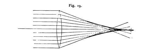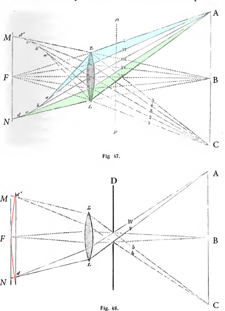 In Fig. 47. (Monckhoven) above, if we assume the approximation that the beam of light coming out of point B, on the axis of the lens, converges satisfactorily on F, we observe that the light coming from point A, when passing through the upper part of the lens (marked in blue) converges at a much shorter distance than the light emitted by the same point A passing through the lower part (green beam). Considering that the green part, although it is not ideally converging on the same plane in which F is, it is converging to a distance much closer to the plane of F as compared to the blue beam. The solution was to cut the portion that most badly damaged the image.