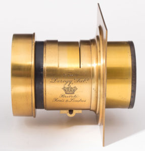 [mks_one_half]French lens from Darlot, produced around 1862 and has a focal length of 240 mm with aperture f/4. It can be reversed and its achromatic doublet, alone, is then used as a lens for landscapes. The peculiar form as Jamin (predecessor of Darlot) mounted the rear doublet had the objective to avoid internal reflections and is called cone centralisateur, it was successful in its time. For more details on this lens visit this page: Cone Centralisateur – Darlot Opticien.[/mks_one_half]