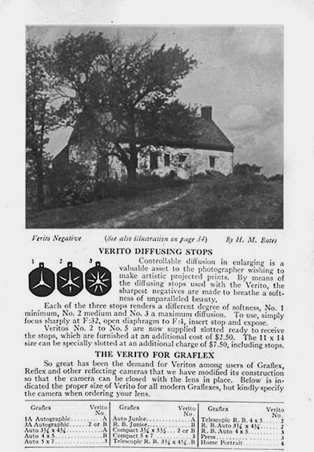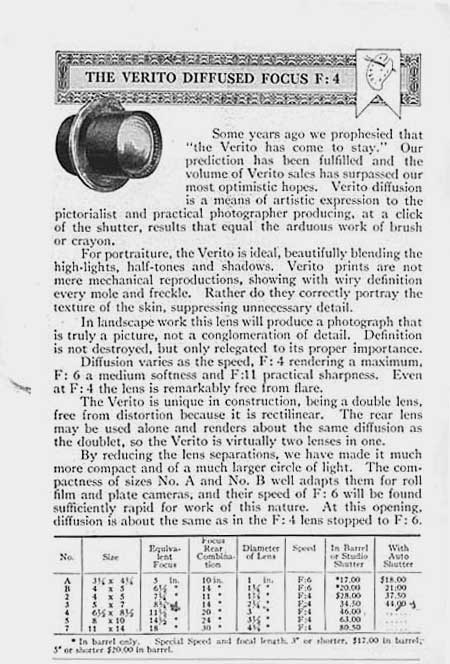 Above we have the Veritar design, it is a more recent release but it follows the same basic Verito original configuration. Both are 3 elements in 2 groups and the arrow, in the diagram, shows the light direction. A very simple construction, even more than the Petzval from 1840, with 4 elements in 3 groups, the very first lens intended for portraiture. It is interesting to read the argumentation we find in Wollensak’s literature in favor of diffused focus. While most of producers were struggling for the best possible lens definition, Verito promised do not get there and promoted this shortcoming as an advantage: “Verito prints are not mere mechanical reproductions, showing with wiry definition every mole and freckle. Rather do they correctly portray the texture of the skin, suppressing unnecessary detail”.