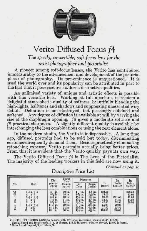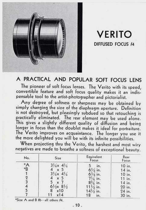 Bellow is an instance from a book edited in 1947 called Professional Portrait Lightings. It is a lighting manual made through a collaborative work with many professionals photographers sharing their tricks and techniques. Many shots were done with soft focus lenses and, of course, Veritos were proudly represented.