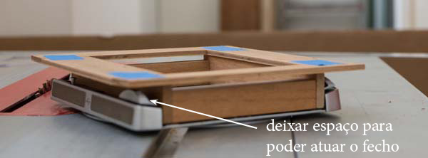 Sobre essas 4 peças iniciais virá a caixa propriamente dita. A foto acima mostra a sua base apoiada na moldura e montada com fita adesiva azul. Ela precisa ser maior para acomodar a placa de LEDs. A altura da moldura inicial deve ser a menor possível mas precisa permitir se atuar sobre o fecho do back. No caso desse back de Linhof, foi preciso deixar 15 mm para que o fecho possa ser deslizado travando a caixa. Para tanto, a altura das laterais dessa primeira moldura foi de 24 mm.